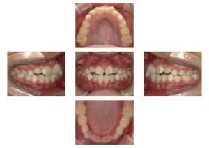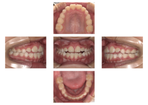 低位舌と口唇閉鎖不全、逆嚥下がみられ歯並びは上唇の口唇閉鎖力が足らず上の前歯に隙間ができ、間違った飲み込み方による頬や唇からの圧力で上顎が狭く下の前歯のがたつきが見られました。